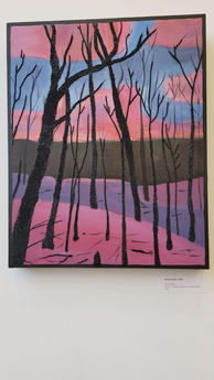 Watercolor of southern tier New York lumber operation. Forklift in the foreground picking up a log to be sawed by standing man with a chainsaw. A pile of wood chips in midground, forest in the background.