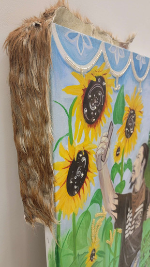 Adding beadwork to the paintings and framing the portraits with animal hides (the fawn I harvested and tanned from roadkill) as well as juxtaposing contemporary symbols of "Techno sapiens" and the natural world represent a "re-indigenized" practice.